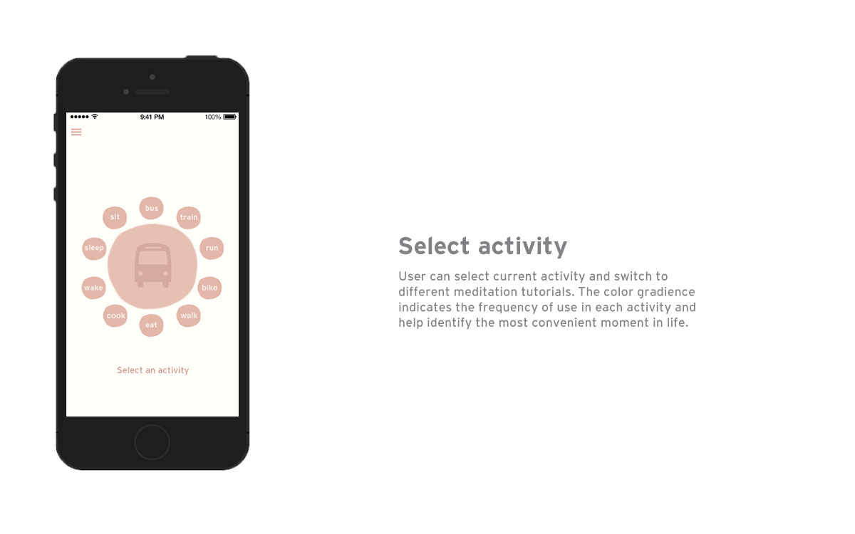 There is a growing awareness in the U.S. that meditation can bring positive effect to people's emotional well-beings, especially in today's fast-paced lifestyle. People interested in meditation can find a variety of apps providing guided meditation, soothing music and timers to start with. Among them, Headspace is the fastest growing app with 11 million downloads and $50 million annual revenue. However, one of the biggest challenges for Headspace users is to find a quiet space and spend 20 minutes to practice meditation out of their busy schedule. Omedi is a meditation app that helps users practice meditation in daily routines, such as commuting and exercising, and enjoy immersive meditation experience in fast-moving urban lifestyle.